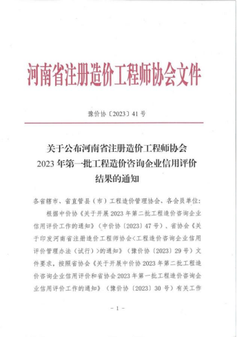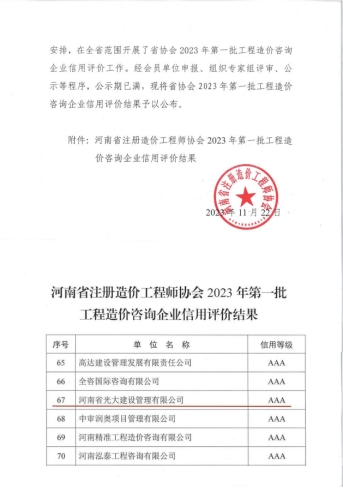 近日,河南省注册造价工程师协会发布《关于公布河南省注册造价工程师协会2023年第一批工程造价咨询企业信用评价结果的通知》(豫价协〔2023〕41号),河南省光大建设管理有限公司荣获河南省注册造价工程师协会2023年第一批工程造价咨询企业信用评价“AAA”等级。