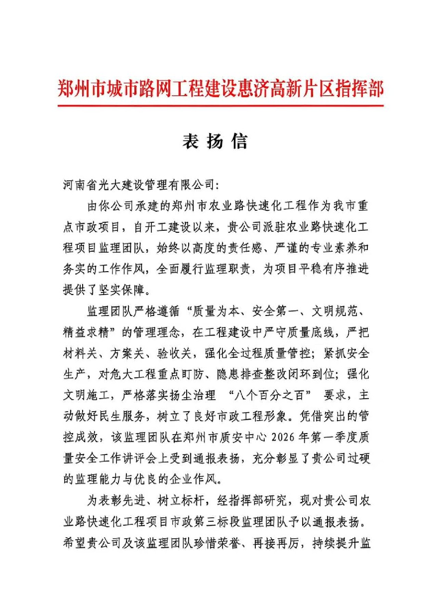 近日,郑州市质量安全监督中心召开项目质安讲评会, 河南省光大建设管理有限公司凭借在 郑州市农业路快速化工程项目三标监理工作中的突出表现,以严谨专业的服务、扎实高效的管控、精益求精的态度,获得质安中心领导、专家及各参建单位的一致认可与高度表扬。